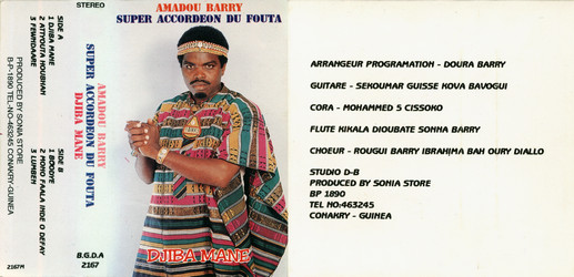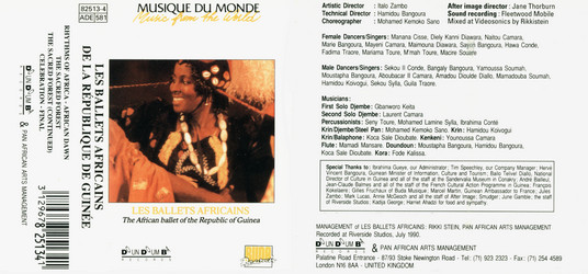 | Lovely album that features some of Guinea's top voices - not a compilation of previous releases as far as I can make out as they are all singing to virtually the same group of top rank backing musicians. Tracks: Sekouba Bambino - Tolonke. Ibro Diabate - Tonton and Longoba. Fode Kouyate - Abadan and Photo Star. Kerfala Kante - Mousso. Amadou Sodia - Wodike and Djanto. Sekouba Fatako - Mafidjen. Fode Baro - Trinsaba. I'll be keeping an eye out for Amadou Sodia after listening to Wodike and Djanto, that is definitely a CLASS act and so is Sekouba Fatako's Mafidjen, love those flutes! [10T/56M] Please Note there is a distortion in the recording of the first two seconds of track 1. Originally issued as a 12 track cassette with tracks as listed on right however tracks Conakry and Africa have been omitted on these Ghana made cassettes and have been blanked out on the inlay card. BRAND NEW AND STILL SEALED. | 1. TOLONKE 2. TONTON 3. ABADAN 4. MOUSSO (5. CONAKRY) 6. WODIKE 7. MAFIDJEN 8. TRINSABA 9. DJANTO 10. PHOTO STAR 11. LONGOBA (12. AFRICA) | ||||