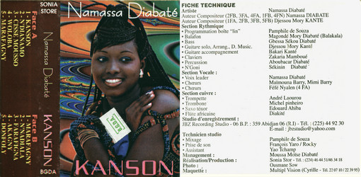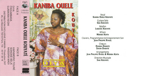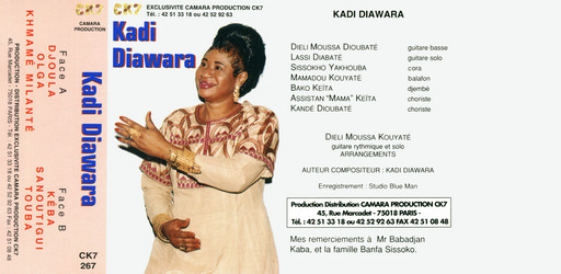 | Originally released back in 1991 and then re-released by Camara as a download in 2017. It can be found on YouTube, Amazon, Apple and many more. However if it has a cover image made by widening the original cassette picture or it has only the 6 tracks on the left then steer well clear of it. The recording has been butchered. I could find only one correctly recorded track on the web which was on YouTube. Nassira Madi put up by KATA(unreadable) and showing the original cassette cover with a slim looking Kaniba and a red cassette. Have a listen to my clips and compare them to the others and you will see what I mean. Three of the tracks are in my computer juke box which tells you how good it is. A VERY, VERY RARE ITEM | 1. DIYA 2. FROUMBADA 3. DJANKINA KEGNI 4. KARAMDRO TOURE 5. SONGNE BELA 6. NASSIRA MADI | ||||